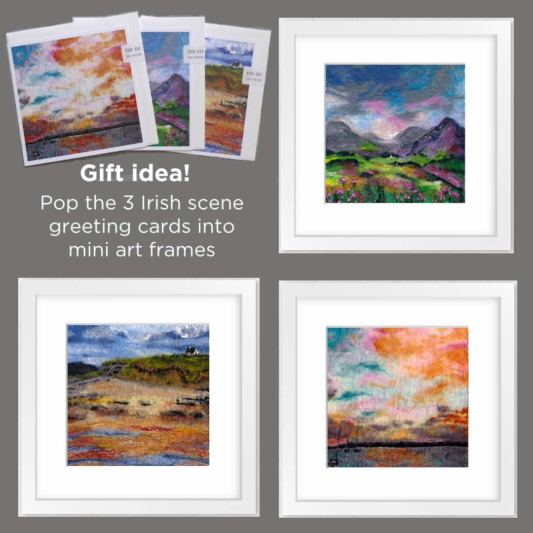 These Irish greeting cards depict scenes of Ireland. Professionally scanned and printed from the original felt landscapes. The original felt art was wet felted, needle felted with hand sewn embroidery embellishments. All this detail has been captured on the cards.