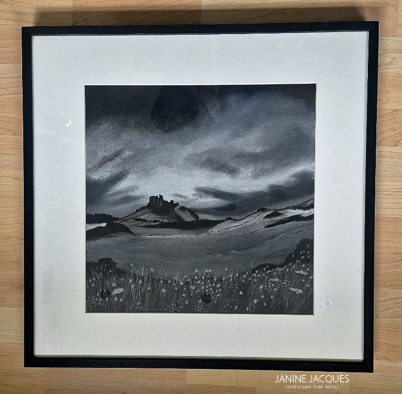 This is an original charcoal drawing, created by hand and inspired by a Northumerland landscape of Bamburgh Castle.