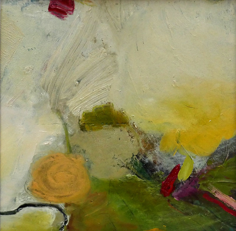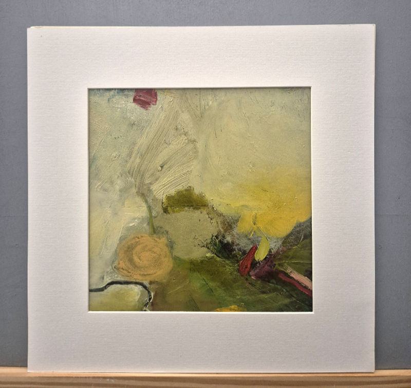 “From Above No.1” is an abstract painting created through layering acrylic paint with subtle touches of oil paint on top. The piece has a soft, atmospheric feel, like looking down onto a landscape from above. Gentle creams and yellows blend with earthy greens, while small pops of red add unexpected life and movement.